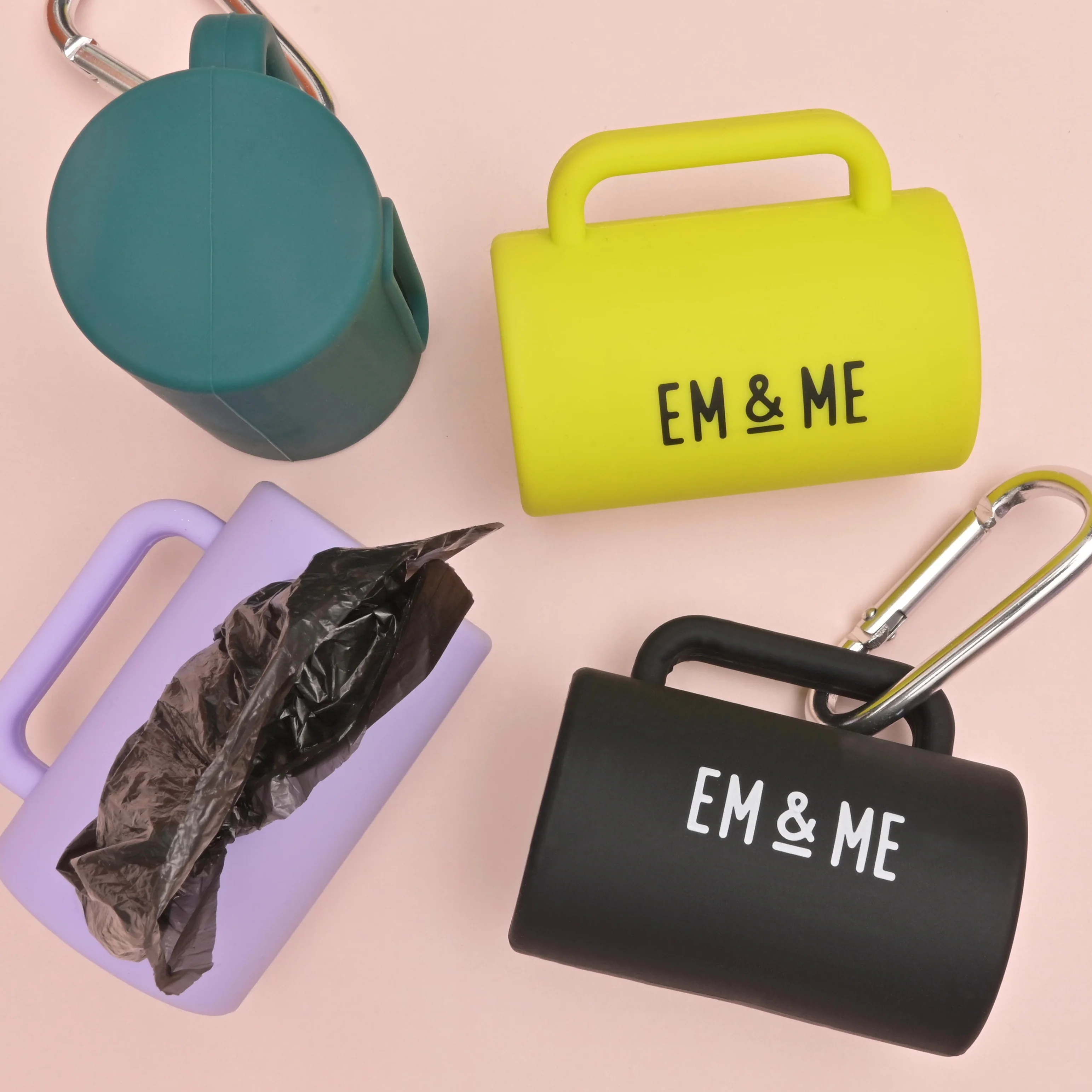 Minimal, one piece easy to use poop bag holder. Simply push the roll through the opening and go. Soft silicone is waterproof and bounces around quietly. Clip hooks on your leash, keychain, collapsible bowl or anything else!